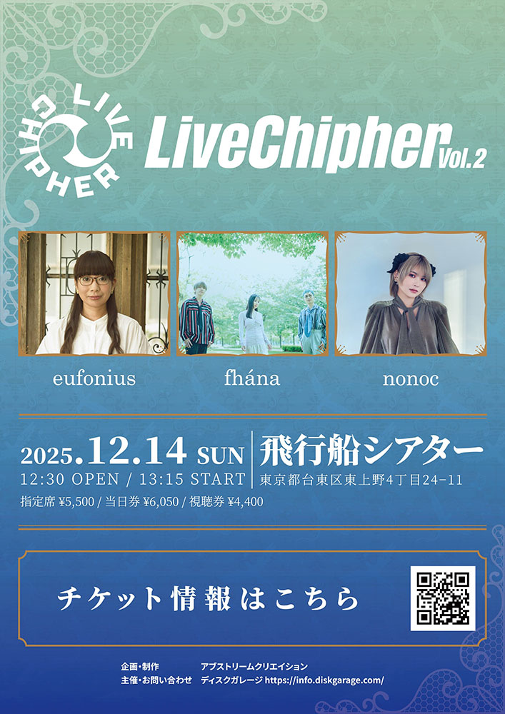 2025年12月 Live chipher Vol.2 開催概要 ■日時 2025年12/14(日) 開演13:15 (12:30 開場) ■出演者 eufonius/fhána/nonoc ■チケット 指定席 5,500(税込) ◎最新の情報や、公演についてのお問い合わせは下記公式サイトをご確認ください。 公式サイト Tweet Share Hatena RSS Pin it はるフェス × JAPAN IDOL SUPER LIVE 2025@飛行船シアター編 前の記事 RAB ESPICE 5周年イベント『コネクト5』 次の記事